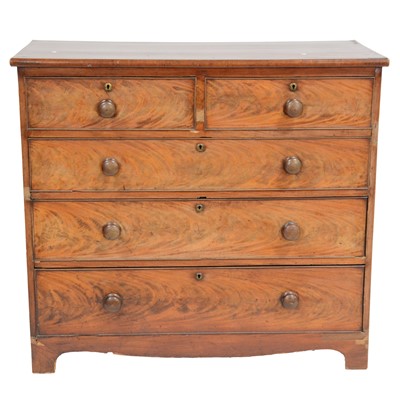 Victorian mahogany chest of drawers, two short and three long drawers with turned handles, bracket feet, width 107cm, depth 50cm, height 97cm.