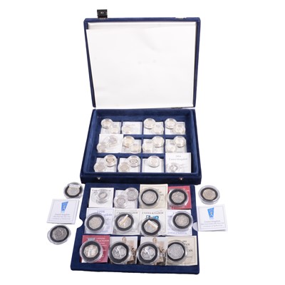 Twenty-six silver proof £1 coins; and thirteen silver proof 50p coins; all in individual plastic cases, most with CoAs. (Qty: 39)