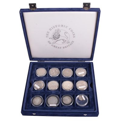 A Plantagenet silver coin, possibly Edward I; Victoria and later coins, some with CoAs, to include crowns; half-crown; double florin; florin; and a (Qty: 1 box) ... read more