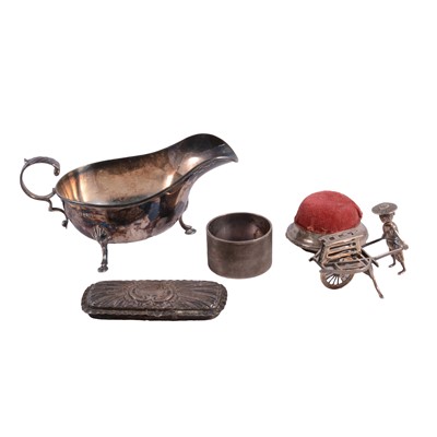 Silver cream jug, Charles Green & Co, B'ham 1945; a silver napkin ring, embossed silver box cover of oblong form, a silver pin cushion (weighed), (Qty: 5) ... read more