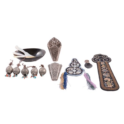 SOLD Lot 182 - Two Oriental white metal pockets, Chinese silver menu stand, silk panels, etc