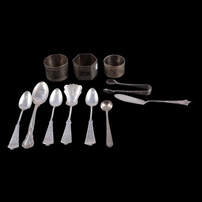 Georgian and later silver teaspoons, sugar nips, caddy spoon, and small white metal wares.