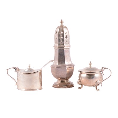 A silver caster, Mappin & Webb Ltd, Birmingham 1929, octagonal panelled form, 17.5cm; a silver mustard pot, Jay, Richard Attenborough Co Ltd, Chester (Qty: 4) ... read more