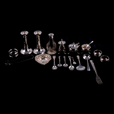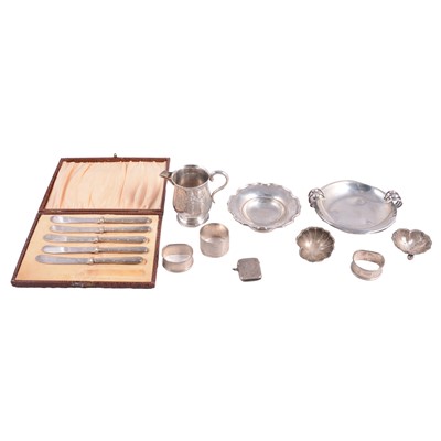 Quantity of silver items, weighable 15toz, including a small footed dish, Aiken Bros, Birmingham, 1964, piecrust outline, 11.5cm diameter, set of six (Qty: 2 boxes) ... read more