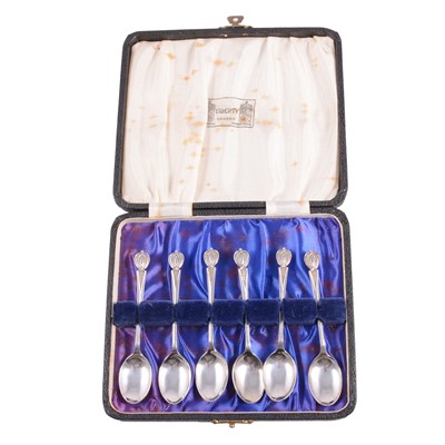 A set of six silver coffee spoons, Liberty & Co Ltd, Birmingham 1953, stylised crown finial, with 1953 Coronation hallmark, in a fitted Liberty box, ... read more