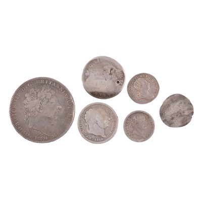George II crown (1820), edge marked LX; George III shilling (1816); threepence (1762); two other silver content coins, one drilled; and Napoleonic (Qty: 6) ... read more