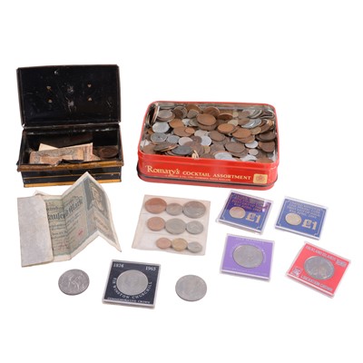 A collection of 19th century and later British and worldwide coins, and bank notes, to include George II and later copper coins; Victoria and later (Qty: 1 box) ... read more