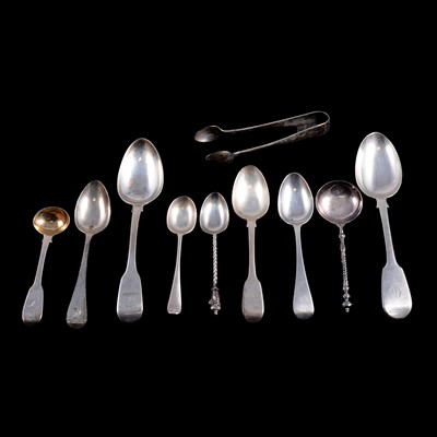 A Victorian silver teaspoon, Robert Williams, Exeter 1838, engraved initials; a Georgian silver teaspoon, marks rubbed; pair of Georgian sugar tongs; (Qty: 1 box) ... read more