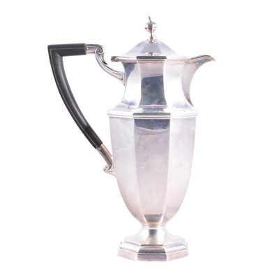A silver hot water jug, Mappin & Webb Ltd, Sheffield 1937, octagonal panelled form, octagonal foot, ebony handle, 25.5cm, gross weight 20oz.