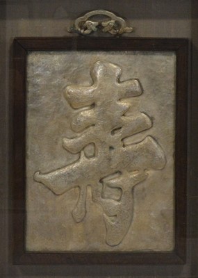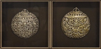 Two Chinese white metal screen panels, rectangular forms, embossed and tooled, in hardwood frames with suspension handles, each measuring (Qty: 2) ... read more