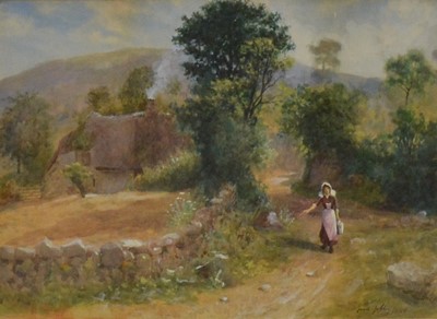 Martin Gwilt Jolley, Figure on a country lane with cottage, watercolour, signed and dated 1884, 34x48cm.