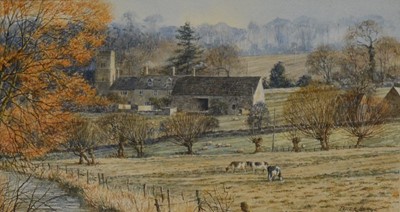 Peter Hodge, Cotswold farm nr Babington, watercolour, signed, 16x28cm.