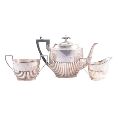 Silver three-piece tea set, Walker & Hall, Sheffield 1929 (teapot) & 1932 (milk and sugar), semi fluted bodies, ebony hand and finial to teapot, (Qty: 3) ... read more