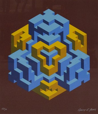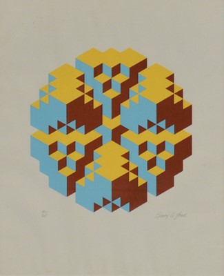 Garry A Jones, Geometric optical composition in teal, yellow and brown, signed and numbered, ltd ed screenprint, 14/45, 63x51.5cm.
