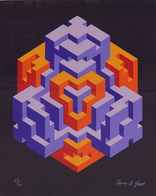 Garry A Jones, Geometric optical composition in purple and orange, signed, screenprint, ltd ed 43/80, 49.5x43cm.