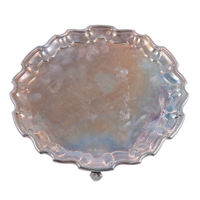 A circular silver salver, Sheffield, date mark and maker's mark rubbed, shaped rim, on three scrolled feet, 31cm, 26.2oz.
