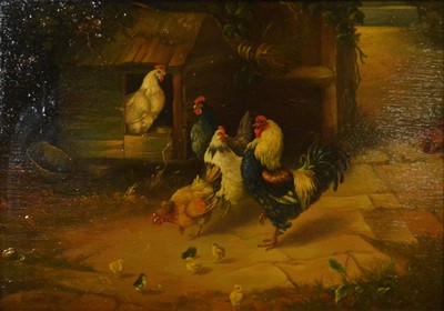 SOLD Lot 205 - E Hunt, Chickens in a yard