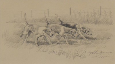 Joy Hawken, Hound sketch, pencil, signed dated 1982, 15x25cm; together with three limited edition hunting prints After Hawken, Wednesday Country on (Qty: 4) ... read more